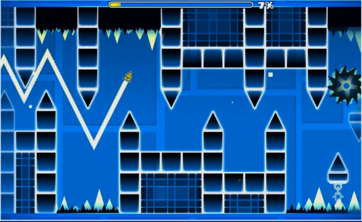 La mecánica central no varía: el icono avanza solo y tú controlas cuándo salta o cambia de estado. Lo que hace que Geometry Dash sea diferente de otros juegos de ritmo es que no hay puntuación por timing como en Guitar Hero. O llegas al final del nivel o empiezas desde cero — con la excepción del modo práctica. Esta dureza es precisamente la que genera la adicción: cada intento fallido está a un toque de convertirse en el exitoso.