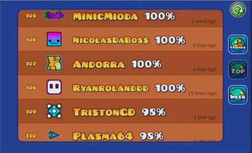 Geometry Dash tiene un sistema de ranking global basado en estrellas acumuladas. Las estrellas se obtienen completando niveles oficiales y de usuario puntuados por la comunidad. Las tablas de clasificación se actualizan semanalmente y permiten filtrar por amigos, región o global. Entrar en el top 1000 mundial requiere cientos de horas de juego y dominar niveles de dificultad Insane o Demon.